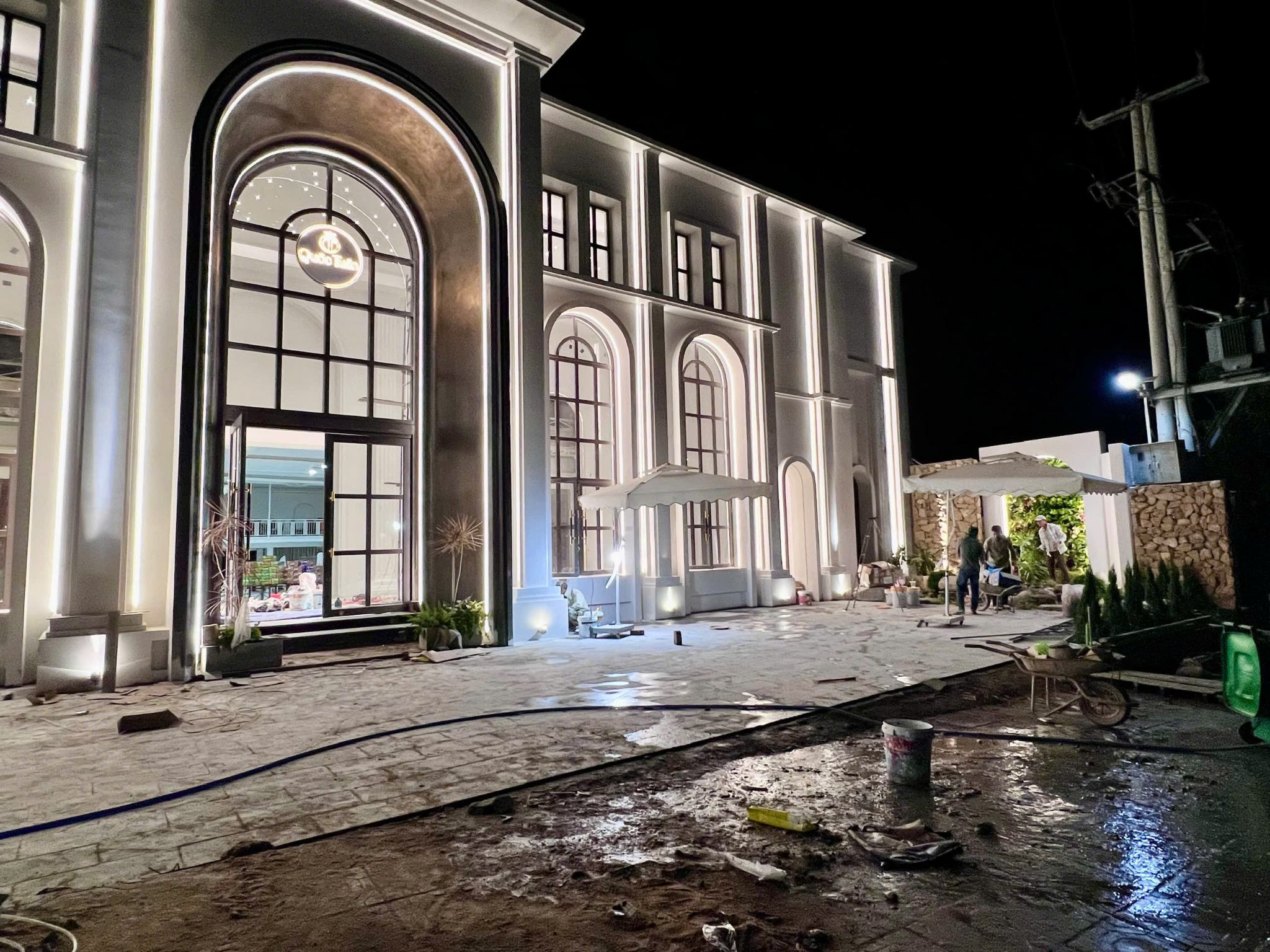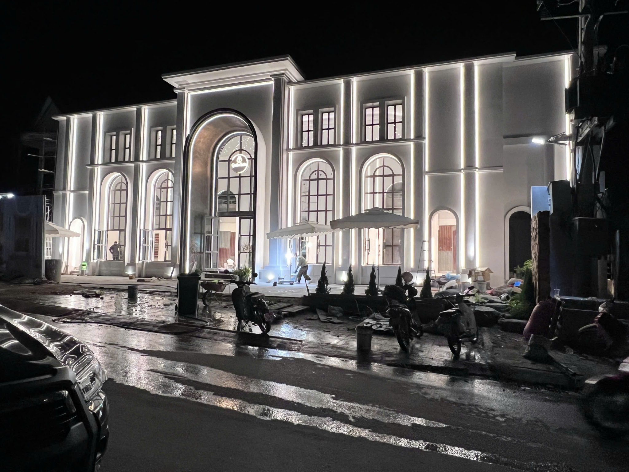Ánh sáng có điểm nhấn rõ ràng, làm nổi bật mặt tiền, khu vực sảnh tiệc, cột trang trí và khu vực bàn tiệc.