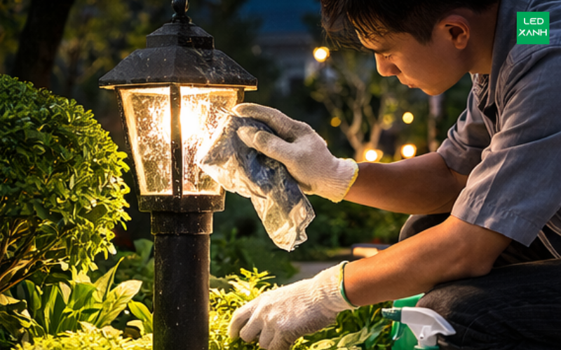 Nhiều người nghĩ rằng đèn sân vườn chỉ cần lắp đặt là có thể sử dụng lâu dài mà không cần bảo trì. Môi trường ngoài trời đầy bụi bẩn, xác côn trùng, lá cây mục và mạng nhện. Khi bám vào mặt kính, chúng cản trở ánh sáng; khi bám vào thân đèn, chúng ngăn cản quá trình tản nhiệt tự nhiên.
