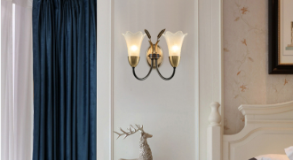 Các mẫu đèn tường đồng kết hợp chao thủy tinh hoặc đèn có thân đèn rõ nét thường được sử dụng cho vị trí này. Ánh sáng xuyên qua chao thủy tinh giúp làm mềm các chi tiết kim loại, đồng thời tăng tính trang trí cho mảng tường đầu giường mà vẫn đảm bảo công năng chiếu sáng.