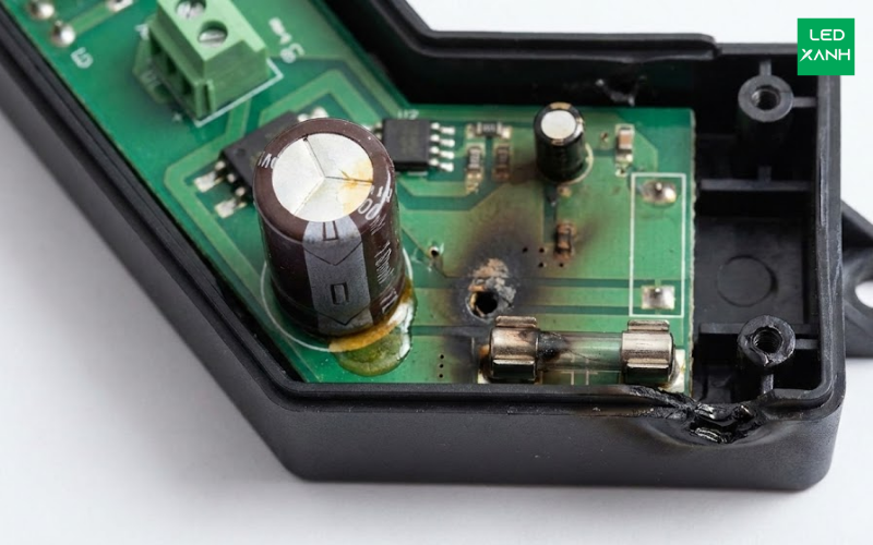 Trong cấu tạo của Driver, tụ hóa (tụ điện phân hay electrolytic capacitor) là linh kiện quyết định tuổi thọ của bộ nguồn. Các dòng đèn âm trần phân khúc thấp thường sử dụng tụ điện có định mức nhiệt độ thấp (ví dụ: 85°C thay vì 105°C). Khi đèn hoạt động liên tục, nhiệt độ môi trường bên trong Driver tăng cao làm dung dịch điện phân trong tụ bị bay hơi, dẫn đến hiện tượng "khô tụ". Kết quả là điện dung giảm, khả năng lọc nhiễu mất đi, gây ra hiện tượng đèn nhấp nháy (flicker) hoặc mất nguồn hoàn toàn.