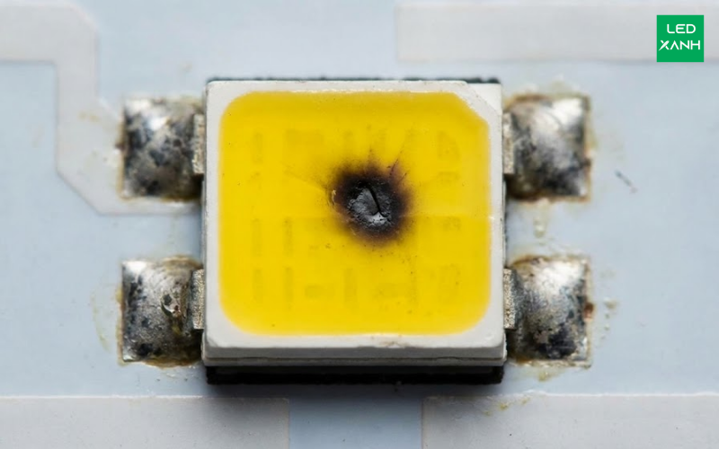 Biến đổi màu sắc (Color Shift): Lớp bột huỳnh quang phủ trên bề mặt chip bị lão hóa do nhiệt, khiến ánh sáng chuyển sang màu tím hoặc xanh lạnh.