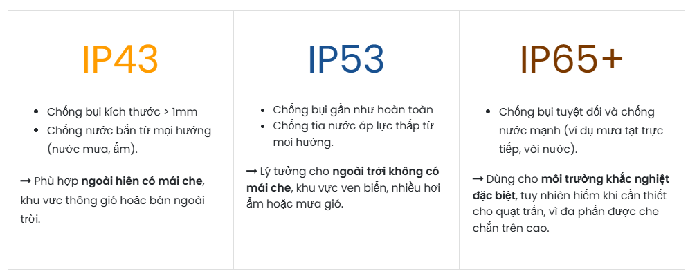 Cụ thể, quạt ngoài trời có 2 chuẩn: damp-rated (cho không gian có mái che, tiếp xúc hơi ẩm) và wet-rated (cho ngoài trời mở, tiếp xúc trực tiếp nước mưa). Để khắc phục, hãy luôn kiểm tra chứng nhận tiêu chuẩn IP của quạt trước khi mua. Với khu vực ngoài trời phải chọn quạt có phân loại chịu ẩm phù hợp.