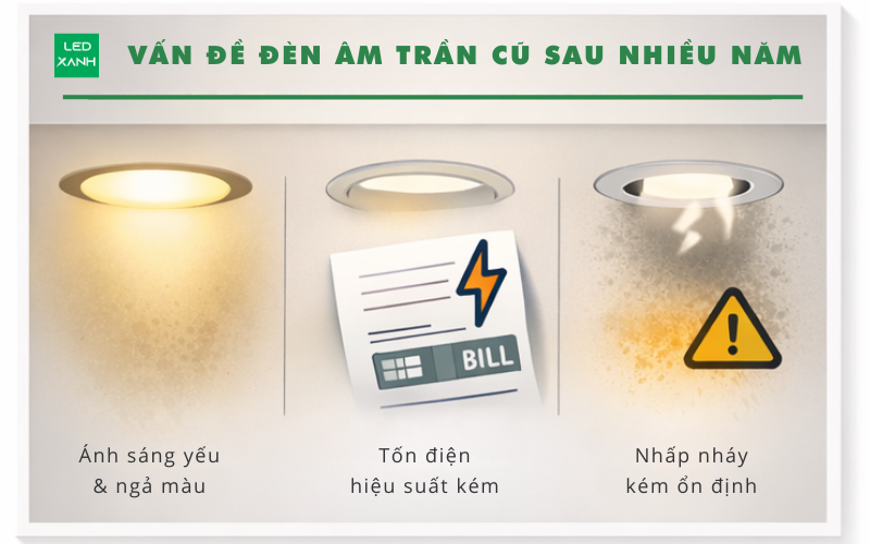 1. Đèn âm trần cũ sau nhiều năm sử dụng thường gặp những vấn đề gì?