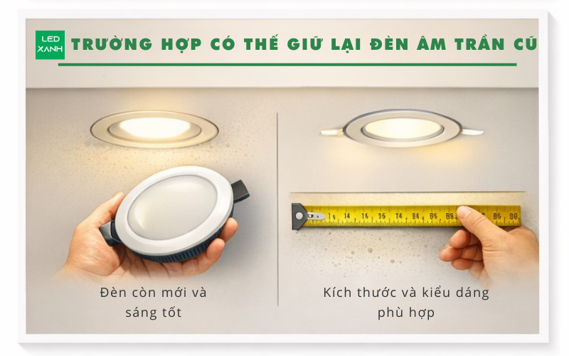 Nếu đèn âm trần mới sử dụng 1–2 năm, ánh sáng đều, không nhấp nháy, không đổi màu, bạn có thể cân nhắc giữ lại để tiết kiệm chi phí.