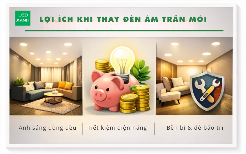Nhiều mẫu đèn âm trần cũ có hiệu suất phát quang thấp, tiêu thụ điện nhiều hơn so với đèn LED âm trần thế hệ mới. Việc giữ lại toàn bộ đèn cũ có thể khiến chi phí điện năng hàng tháng cao hơn mà ánh sáng vẫn không tối ưu.