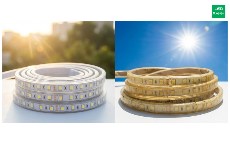 Giải pháp là chọn các loại dây LED có vỏ bọc kháng UV (UV resistant) hoặc lắp đặt trong thanh nhôm định hình LED hoặc Silicon đèn LED để chắn tia cực tím.