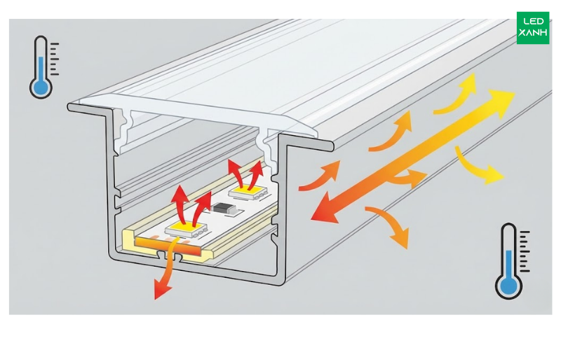 Đừng bao giờ dán trực tiếp dây LED công suất cao lên bề mặt gỗ hay thạch cao ngoài trời. Hãy sử dụng nẹp nhôm hoặc thanh nhôm định hình. Nhôm là kim loại dẫn nhiệt tuyệt vời, nó sẽ đóng vai trò như một bộ tản nhiệt (heatsink), hấp thụ nhiệt từ dây LED và tỏa ra không khí, giúp chip LED hoạt động ở nhiệt độ lý tưởng và kéo dài tuổi thọ gấp 2-3 lần.