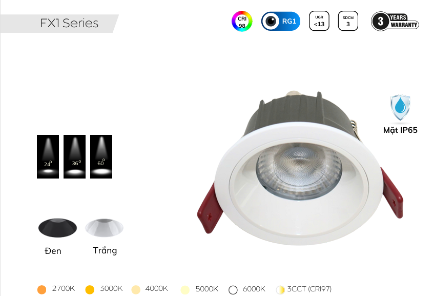 FX1 tạo khác biệt nhờ chuẩn chống nước IP65, phù hợp lắp đặt ở khu vực ẩm như ban công, nhà vệ sinh, hành lang ngoài trời có mái che. Các model khoét lỗ D75 đi kèm công suất 7W, 8W, 10W với CRI 98 (BridgeLux/Brightlux) hoặc CRI 90 (Philips). FX1 được thiết kế chắc chắn, thẩm mỹ, góc chiếu tùy chọn 24°, 36°, 60°, giúp ứng dụng linh hoạt từ chiếu sáng chung đến chiếu điểm.