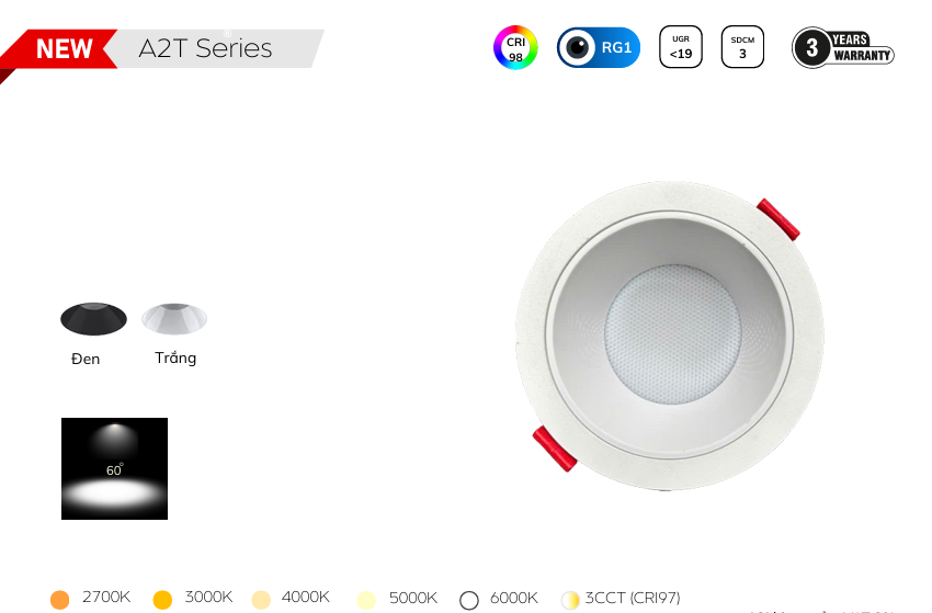 A2T là dòng mới, tập trung vào ánh sáng mịn, đồng đều với CRI 98 và hiệu suất 80–90 lm/W. Thiết kế hiện đại với bề mặt tán quang tinh tế, góc chiếu 60°, màu hoàn thiện Đen/Trắng. Dòng này có các công suất 5W, 7W, 10W, 12W cho khoét lỗ D75 – phù hợp với những không gian cần ánh sáng dịu, không chói và độ trung thực màu cao như nhà ở, khách sạn, căn hộ cao cấp.