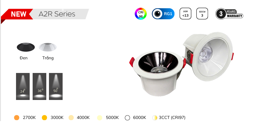A2R là dòng đèn rọi sâu thiết kế thẩm mỹ, sử dụng LED & Driver của BridgeLux/Brightlux hoặc Philips. Với CRI 98 (BridgeLux/Brightlux) và CRI 90 (Philips), ánh sáng của A2R cho độ trung thực màu sắc vượt trội. Những mẫu D75 có các công suất 5W, 6W, 7W, 8W, 10W, 12W cùng góc chiếu 24°, 36°, 50°, giúp tạo điểm nhấn ánh sáng chính xác và sang trọng trong các không gian như showroom, cửa hàng cao cấp, nhà ở tiêu chuẩn cao.