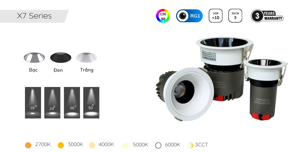 Dòng X7 nổi bật với hiệu suất 80–90 lm/W, CRI 98 ở các model dùng LED/Driver BridgeLux/Brightlux và CRI 90 ở các model dùng Philips. Dòng này có đầy đủ các công suất từ 7W, 8W, 10W, 12W, 15W với kích thước khoét lỗ D75 cho nhiều lựa chọn thiết kế. Đây là một trong những dòng đa dạng nhất của Brightlux, phù hợp hầu hết các nhu cầu chiếu sáng âm trần từ dân dụng đến dự án thương mại.