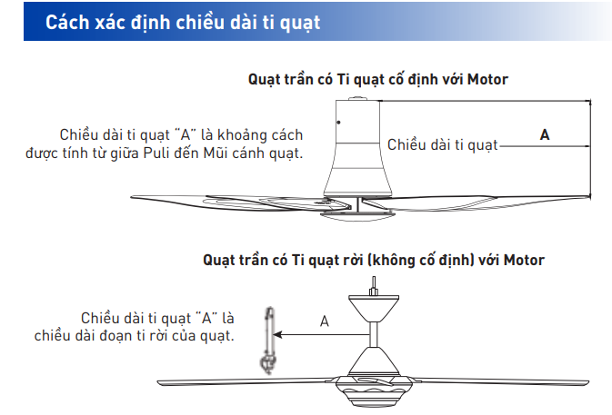 Hiện nay với đa dạng các mẫu mã quạt trần thì việc xác định chiều dài ti quạt cùng khác nhau tùy vào thông số của nhà sản xuất, dưới đây là 2 cách thường dùng phổ biến: