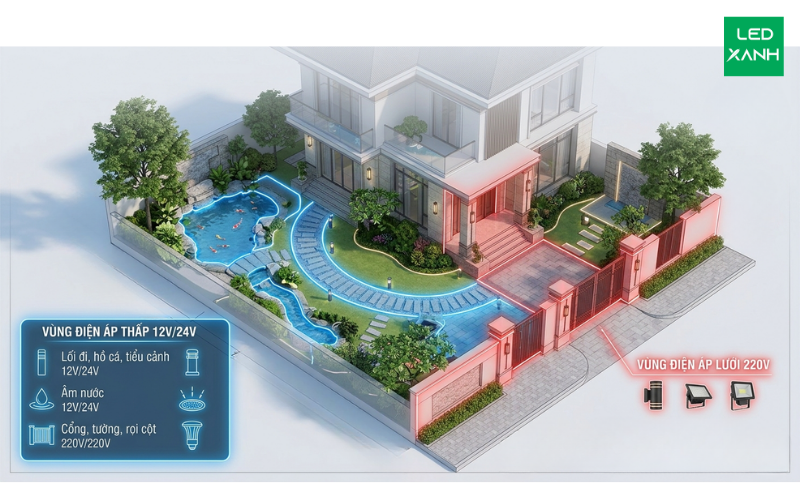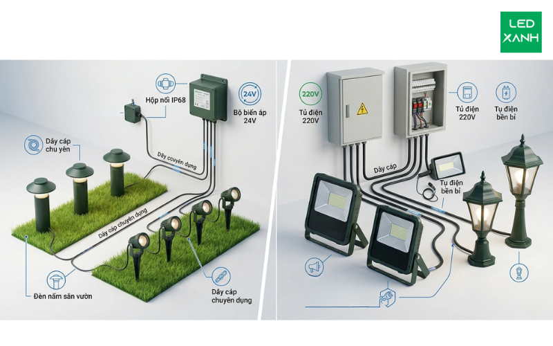 Khi lắp đặt đèn sân vườn, một trong những câu hỏi khiến nhiều gia chủ đau đầu nhất là: Nên đi dây điện 220V trực tiếp hay dùng điện 12V/24V? Thực tế, đây không phải là lựa chọn “cái nào tốt hơn”, mà là cái nào phù hợp hơn với từng điều kiện cụ thể của công trình. Bởi mỗi phương án sẽ khác nhau về mức độ an toàn khi sử dụng ngoài trời, chi phí thi công, khả năng mở rộng hệ thống cũng như độ ổn định khi vận hành lâu dài. Nếu không hiểu rõ bản chất, nhiều người dễ chọn theo cảm tính hoặc theo thói quen thi công, dẫn đến hệ thống chiếu sáng hoạt động kém hiệu quả, tiềm ẩn rủi ro hoặc phát sinh chi phí sửa chữa về sau. Cùng LEDXANH tìm hiểu câu trả lời trong bài viết này nhé!