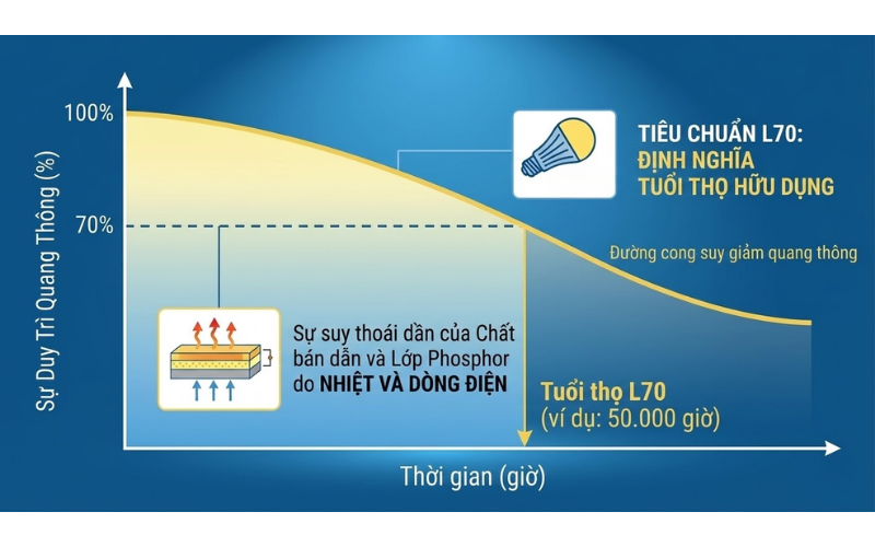 Tiêu chuẩn L70 (Lumen Maintenance 70%) quy định rằng tuổi thọ của một chiếc đèn là khoảng thời gian hoạt động tính bằng giờ cho đến khi quang thông (lượng ánh sáng phát ra) của nó giảm xuống chỉ còn 70% so với mức ban đầu. Ví dụ, một bóng đèn công bố tuổi thọ 50.000 giờ L70 có nghĩa là sau 50.000 giờ thắp sáng, nó vẫn giữ được 70% cường độ ánh sáng lumen nguyên bản. Vượt qua mốc này, mặc dù đèn vẫn sáng, nhưng lượng ánh sáng cung cấp không còn đủ tiêu chuẩn an toàn cho mắt và mục đích chiếu sáng ban đầu.