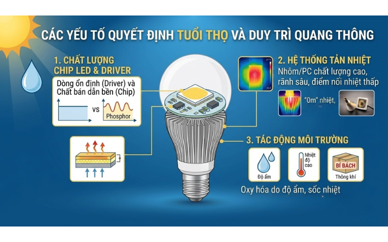 2. Các yếu tố quyết định tuổi thọ và độ suy giảm quang thông của đèn