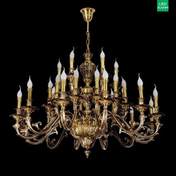- Đèn chùm đồng tay nến: Đây là loại chất liệu đắt tiền trong sản xuất đèn chùm nến. Mẫu đèn này thường có hai màu sắc là vàng đồng hoặc đen đồng cổ. Nhờ vậy, đèn chùm đồng luôn là ưu tiên hàng đầu khi lựa chọn đèn trang trí cho không gian cổ điển, tân cổ điển. Với 16 tay - 30 tay, đèn sẽ có mức giá hàng chục triệu đồng.
