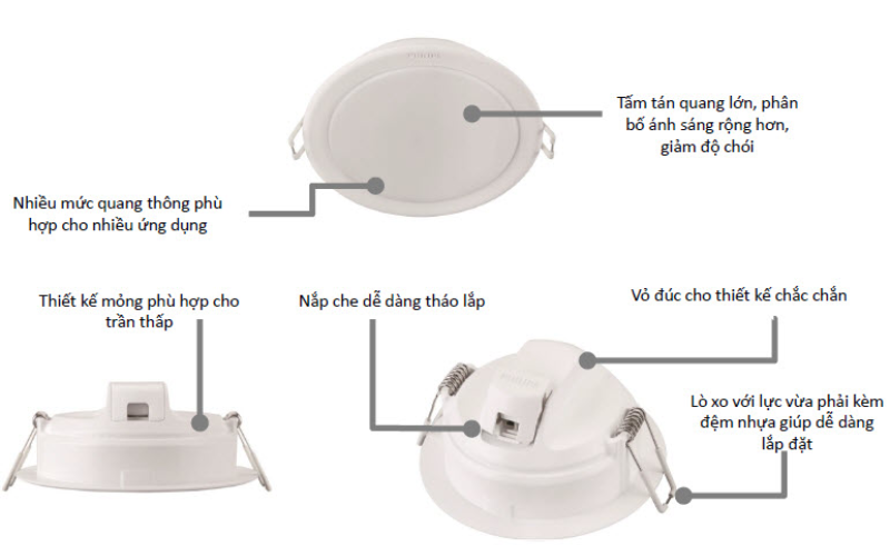 Thân thiện và an toàn với con người, môi trường: Đèn âm trần Philips được làm từ những nguyên vật liệu thân thiện với môi trường, đồng thời không chứa các chất độc hại như thủy ngân, lưu huỳnh, chì và không phát ra tia UV, tia hồng ngoại, tử ngoại nên hoàn toàn an toàn với sức khỏe của người dùng