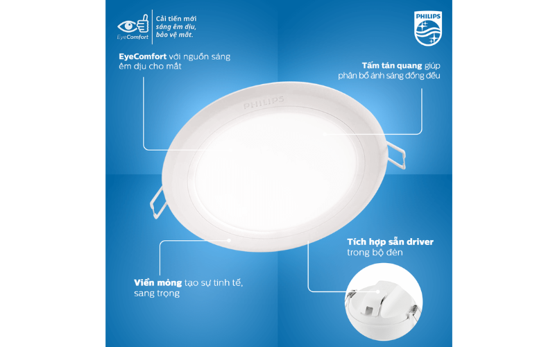 Đèn led âm trần Philips sở hữu công nghệ ánh sáng Eye Comfort, sử dụng công nghệ chiếu sáng LED hiện đại, giúp cung cấp nguồn ánh sáng tự nhiên và an toàn đến không gian và cuộc sống của người dùng.