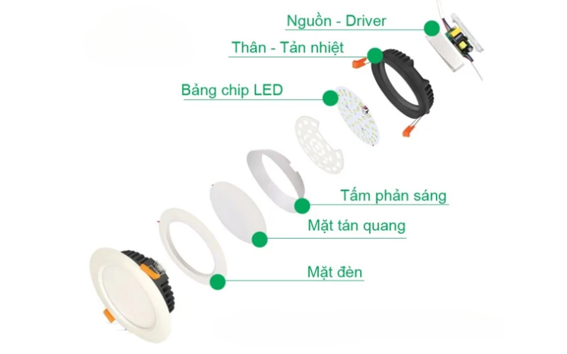 1.2 Cấu tạo đèn led downlight âm trần Rạng Đông