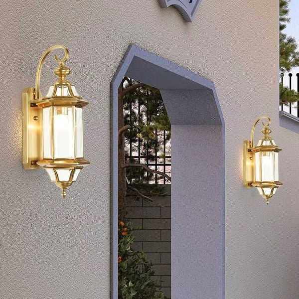 - Đèn tường cổng đồng: Vẻ đẹp sang trọng và đắt tiền chính là điểm đầu tiên mà bạn có thể nhận thấy ở mẫu đèn này. Đèn thường mang màu vàng đồng hoặc màu đồng đen truyền thống. Đây đều là những màu sắc đặc trưng được sử dụng nhiều trong phong cách cổ điển và tân cổ điển. Bên cạnh đó, đèn cổng đồng có độ chắc chắn và bền bỉ cao. Khả năng chống nước mưa, ánh nắng hoặc côn trùng rất tốt. Bạn sẽ không lo đèn sẽ bị han gỉ sau một thời gian sử dụng. Cùng với đó sẽ bảo vệ được phần đèn bên trong, không để đèn bị chập cháy làm ảnh hưởng tới chất lượng chiếu sáng. Chính vì vậy, chất lượng của đèn tường đồng cổng được đánh giá khá cao, đi kèm với đó là mức giá cũng cao.