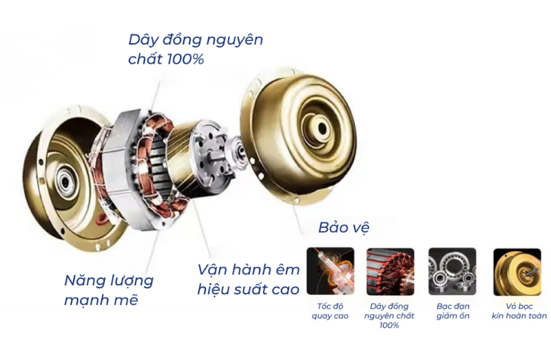Sử dụng dây đồng nguyên chất, động cơ hoạt động mạnh mẽ, ổn định, hạn chế tối đa tình trạng quá nhiệt và đảm bảo tuổi thọ lâu dài.