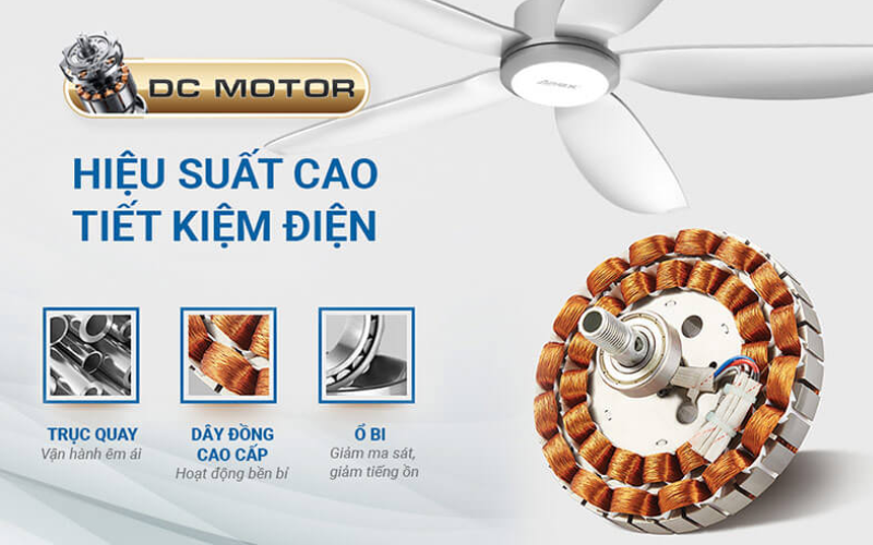 • Tiết kiệm điện năng: Nhờ sử dụng động cơ DC một chiều tiên tiến, công suất nhỏ nhưng vẫn đảm bảo quạt trần có thể hoạt động tốt và mạnh mẽ, điều này giúp quạt trần 8 cánh có thiết tiết kiệm được 50-60% chi phí điện năng so với sử dụng quạt trần có động cơ truyền thống.