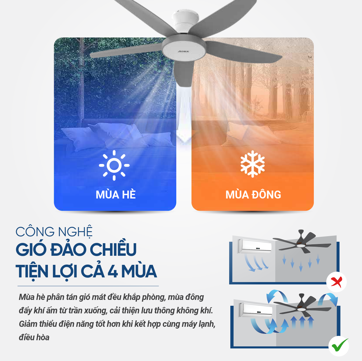 - Vào mùa đông, khi bật chế độ quay ngược, quạt sẽ đẩy luồng không khí ấm từ trần nhà xuống, giúp giữ nhiệt ổn định, làm ấm không gian một cách tự nhiên mà không gây khô da như các thiết bị sưởi truyền thống. Đồng thời, quạt giúp lưu thông khí trong phòng tốt hơn, mang lại cảm giác dễ chịu, thoáng đãng suốt cả mùa lạnh.