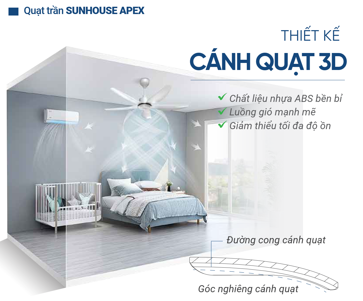 Từ phòng khách, phòng ngủ cho đến không gian quán café, nhà hàng – quạt trần Sunhouse đều có mẫu mã phù hợp. Thiết kế cánh quạt 3D, chất liệu nhựa ABS cao cấp, bền bỉ tạo luồng gió mạnh mẽ và giảm thiểu tối đa độ ồn