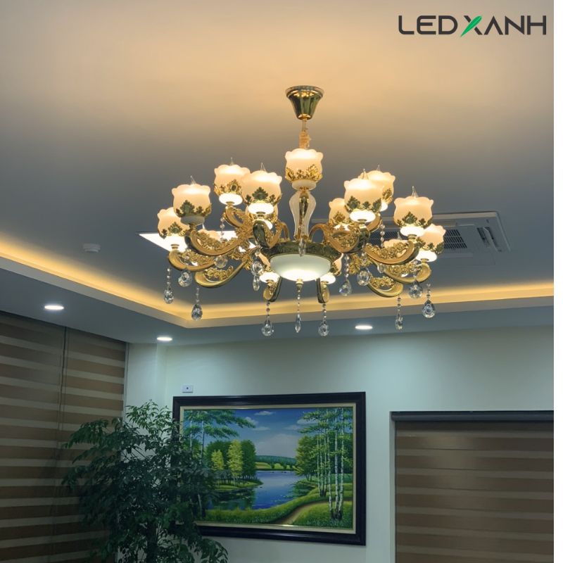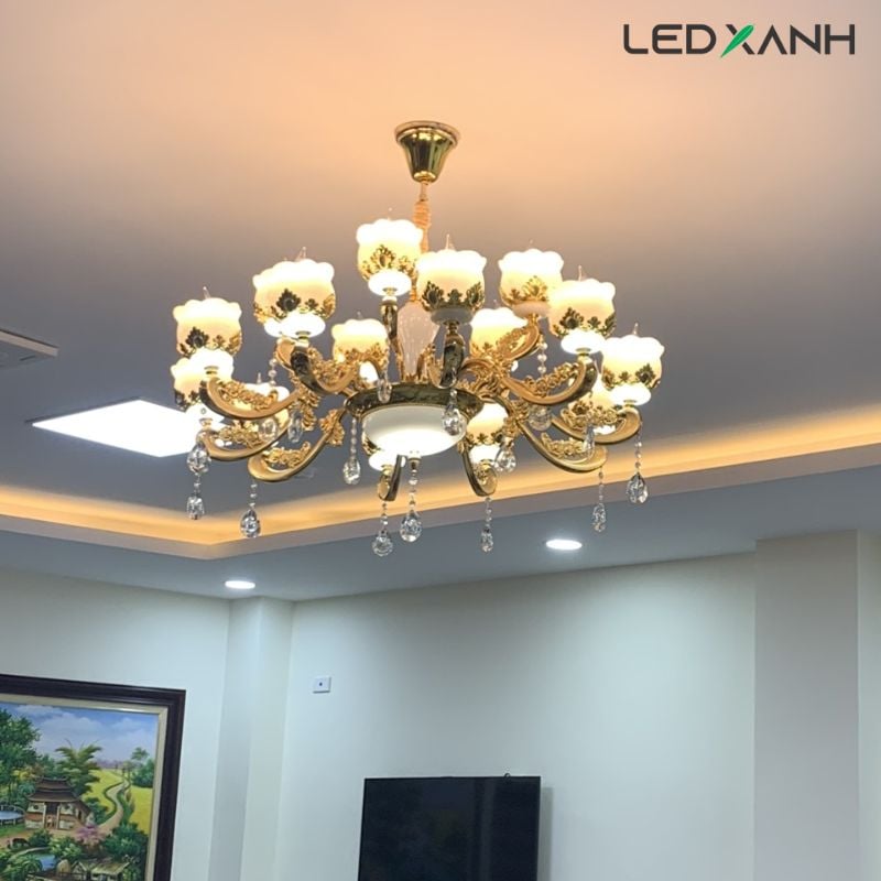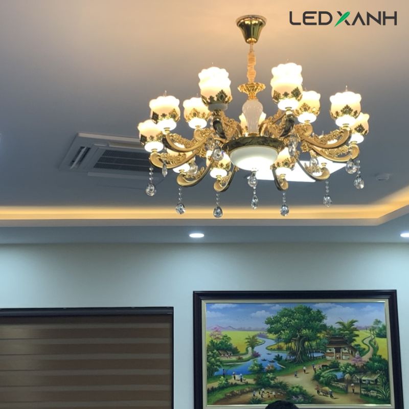 Với các tấm trần thạch cao hiện nay, phương án mà Led Xanh sẽ thi công đó là khoét lỗ trần thạch cao và bắt vít cố định trực tiếp đèn lên trần bê tông. Do các dòng sản phẩm đèn mâm pha lê thường rất nặng, do đó, chúng tôi tuyệt đối sẽ không bắt lên trần thạch cao để đảm bảo an toàn cho quý khách.