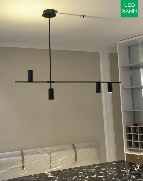 Đèn có độ dài 1m2, gồm 4 chao đèn có dáng hình lon ống bơ được thiết kế bất đối xứng tạo ra mẫu đèn lạ mắt, độc đáo