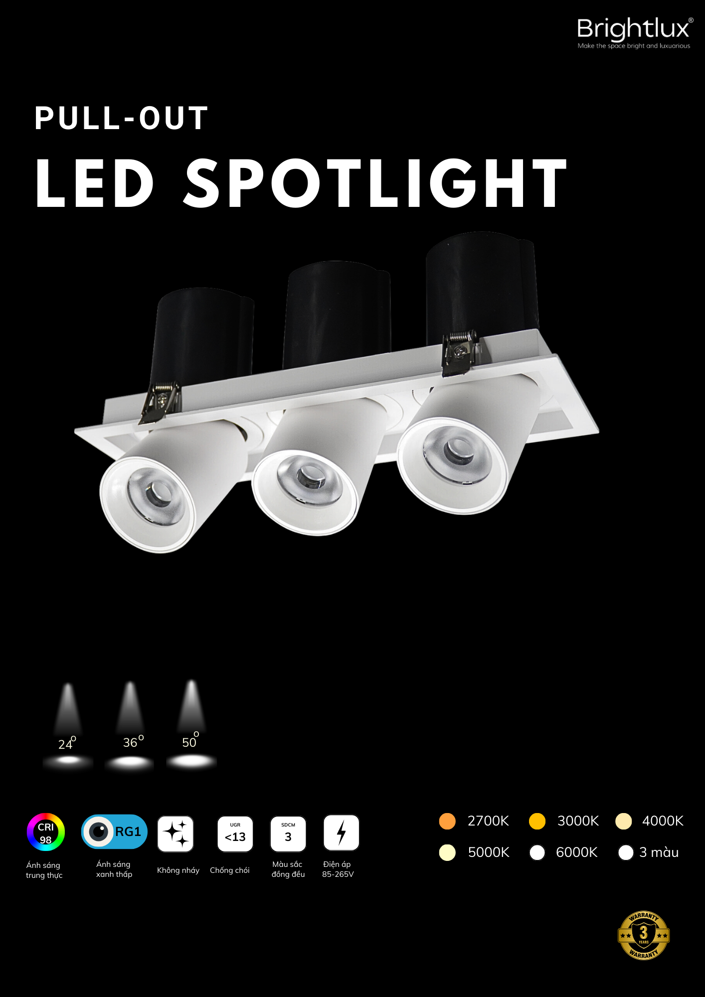 Thiết kế kéo rút âm trần: Sản phẩm có cấu trúc độc đáo, cho phép người dùng kéo rút đầu đèn ra khỏi mặt trần. Khi không sử dụng tính năng rọi, đèn có thể thu gọn lại, tạo một bề mặt phẳng, mang lại sự gọn gàng và tinh tế cho không gian.