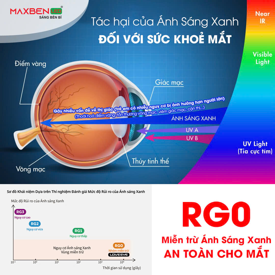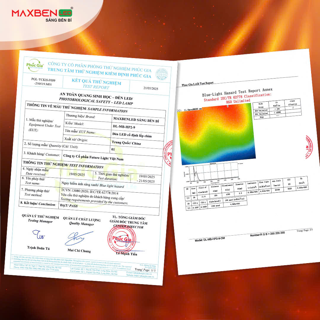 Sản phẩm đèn âm trần Happy V2 Maxben đã được kiểm định và đạt chỉ số RG0 - mức an toàn cao nhất về quang sinh học theo tiêu chuẩn quốc tế IEC/TR 62778:2014 và TCVN 13080:2020.