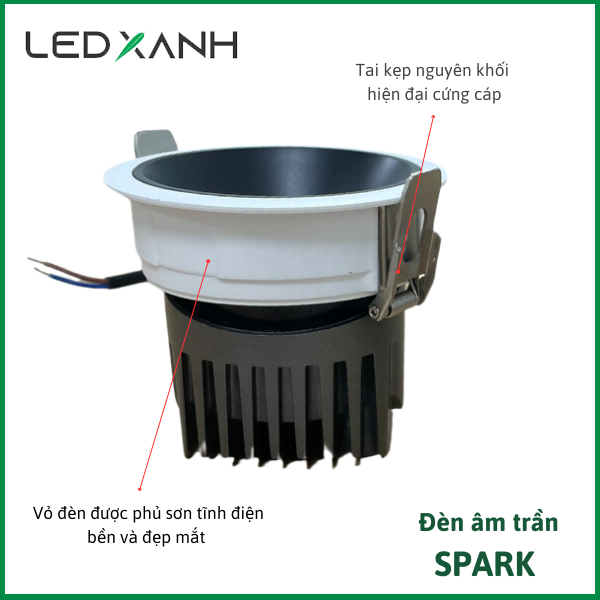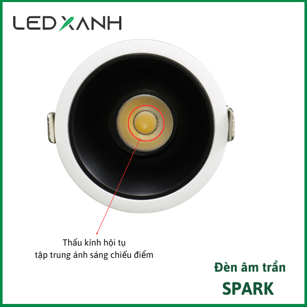Đèn LED âm trần chiếu rọi Spark chó góc chiếu sáng 24 độ, tương tự như các đèn âm trần COB khác trên thị trường. Tuy nhiên, điểm khách biệt của đèn Spark này là nó có thể thay đổi góc chiếu sáng so với góc nghiêng 30 độ và khả năng xoay 180 độ. Thêm nữa, đèn còn có 1 thấu kính hội tụ ở trung tâm giúp gom và tập trung ánh sáng, gia tăng hiệu quả chiếu rọi cho đèn
