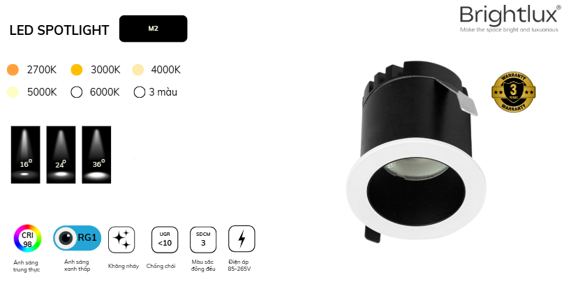 Thương hiệu uy tín – Chất lượng đảm bảo: Là sản phẩm của BrightLux – thương hiệu đèn LED cao cấp, Spotlight M2 được kiểm định chất lượng và bảo hành chính hãng 3 năm. Đèn đạt tiêu chuẩn quốc tế, an toàn cho người dùng (ánh sáng xanh mức RG1) và rất phù hợp cho phòng khách, văn phòng, cửa hàng trưng bày…