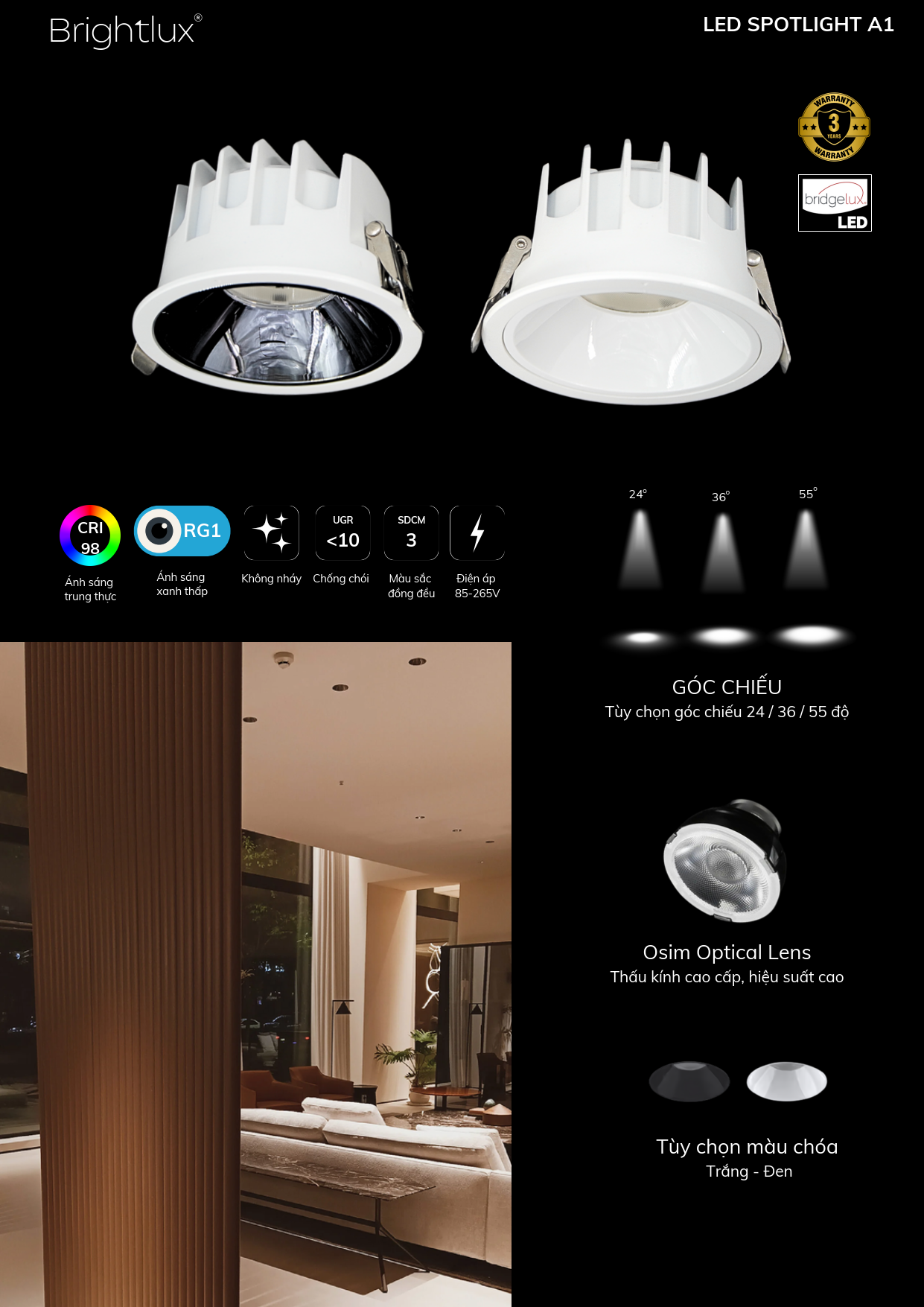 - Góc chiếu linh hoạt 24/36/55 độ, đáp những nhu cầu chiếu sáng cho nhiều không gian khác nhau