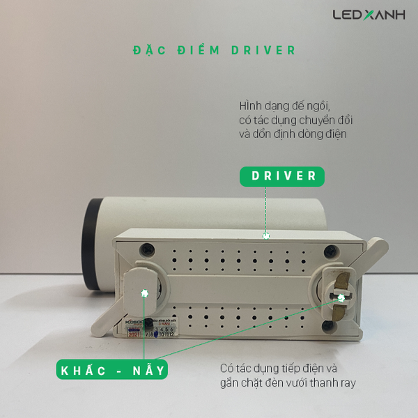 Phía dưới đế driver là 2 khấc nẫy, một khấc là để tiếp điện, khấc còn lại dùng để gắn chặt đèn vào thanh ray. Giúp chúng cố định hoặc di chuyển dễ dàng.
