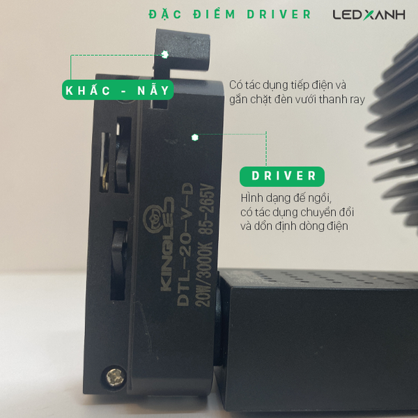 Driver của đèn rọi kingled được thiết kế ở phần đế ngồi của đèn. Phần tiếp xúc với thanh ray.