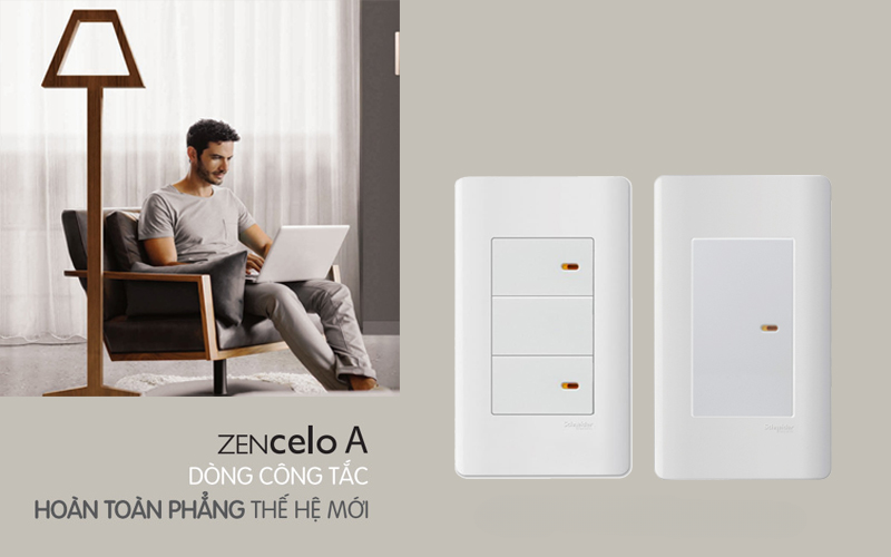 ZENcelo A - Schneider là dòng công tắc ổ cắm hoàn toàn phẳng thế hệ mới, tiên phong khi áp dụng thành công công nghệ IMPRESS, nhấn tắt và mở cùng một vị trí, kết hợp với đèn led báo hiệu giúp xác định được vị trí công tắc trong bóng tối.