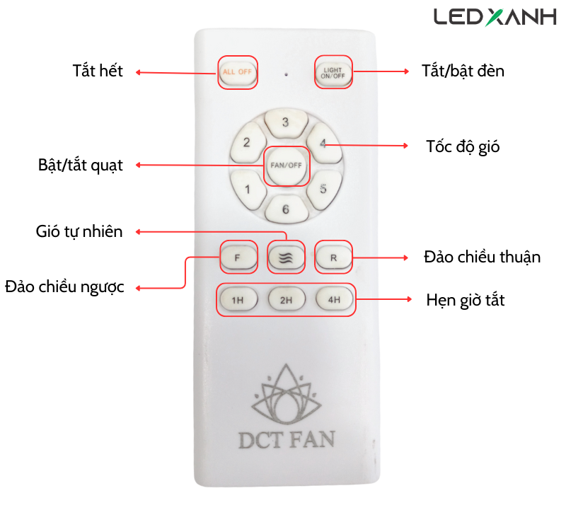 Điều khiển bằng remote: Với các chức năng như bật/tắt quạt, tăng giảm tốc độ gió, thay đổi hướng gió, bật/ tắt đèn chiếu sáng của remote mang lại sự tiện ích cho không gian, nâng cao chất lượng sống cho người dùng