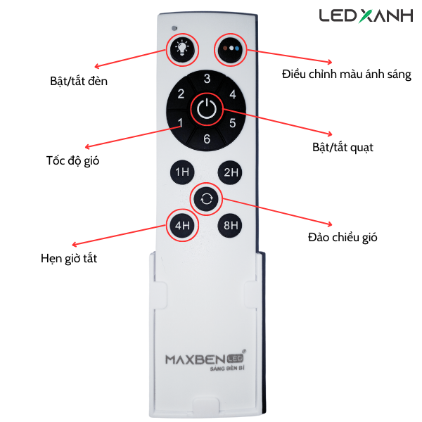 Điều khiển từ xa tiện lợi: Khác với các mẫu quạt truyền thống, phải đến gần quạt, hộp số để điều chỉnh chế độ gió mong muốn, thì quạt trần đèn led Maxben 5 cánh DQ-MB-M021-5-G được cải tiến, có thể điều chỉnh chế độ bật/ tắt quạt, bật/ tắt đèn, điều chỉnh mức gió, hẹn giờ,... từ xa chỉ với một chiếc điều khiển. Khoảng cách để sử dụng điều khiển tốt nhất là cách quạt trần dưới 5m